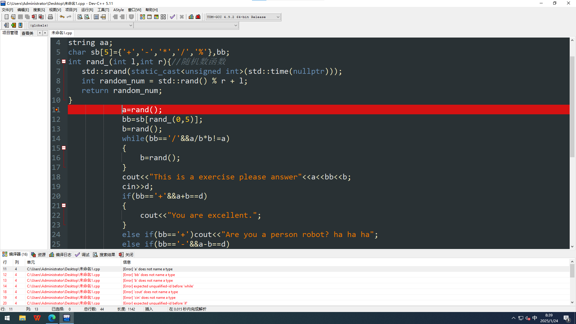 #include"njx.cpp" long long a,b,c,d; string aa; char sb[5]={'+','-','*','/','%'},bb; int rand_(int l,int r){//随机数函数 std::srand(static_cast<unsigned int>(std::time(nullptr))); int random_num = std::rand() % r + l; return random_num; } void answer(bool lan){ a=rand(); bb=sb[rand_(0,5)]; b=rand(); while(bb=='/'&&a/b*b!=a) { b=rand(); } if(lan==0)cout<<"This is a exercise please answer"<<endl<<a<<bb<<b; else cout << "这是一个练习,请回答"<<endl<<a<<bb<<b; cin>>d; string y[2]={"You are excellent.","你太棒了。"}; string h[2]={"Are you a person robot? ha ha ha","您是人机吗?哈哈哈"}; if(bb=='+'&&a+b==d) { cout<<y[lan]; } else if(bb=='+')cout<<h[lan]; else if(bb=='-'&&a-b==d) { cout<<y[lan]; } else if(bb=='-') cout<<h[lan]; else if(bb=='*'&&a*b==d) { cout<<y[lan]; } else if(bb=='*') cout<<h[lan]; else if(bb=='/'&&a/b==d) { cout<<y[lan]; } else if(bb=='/') cout<<h[lan]; else if(bb=='%'&&a%b==d) { cout<<y[lan]; } else if(bb=='%') cout<<h[lan]; Sleep(2000); } -