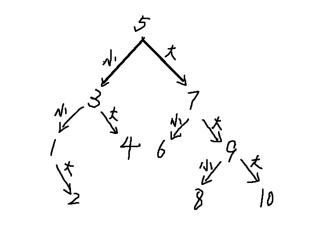 对于原序列来说,排序结果无非是对原序列标号的重排之一,而原序列共有 $n!=n\times(n-1)\times(n-2)\times\cdots\times 2\times 1$ 种重排,每次比较 和 得到的信息无非是 在 前面或者是 在 的前面两种,那么按照这样可以画出一个类似猜数的决策树,每一种原序列的重排都是决策树的一个终止节点(答案)。