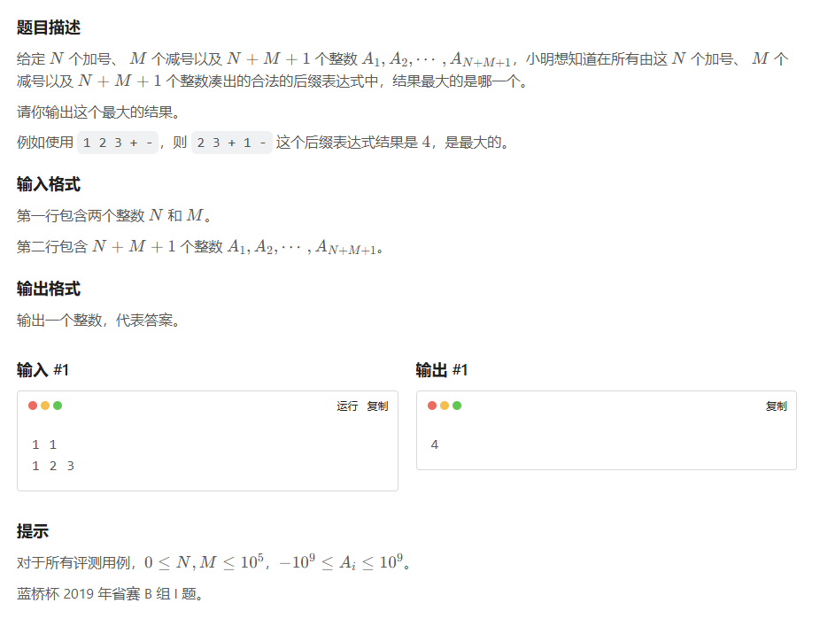 #include<bits/stdc++.h> using namespace std; int n,m,s,maxx=-1,minn=1<<30; long long ans=0; int main() { cin>>n>>m; if(m==0) {//m==0,无最小值可牺牲的特判 for(int i=1; i<=n+m+1; i++)cin>>s,ans+=s;//全加 cout<<ans; return 0; } for(int i=1; i<=n+m+1; i++) { cin>>s; ans+=abs(s); maxx=max(maxx,s); minn=min(minn,s);//求最小值 } cout<<(maxx-minn)+ans-abs(maxx)-abs(minn);//print,牺牲最小值 return 0; } -